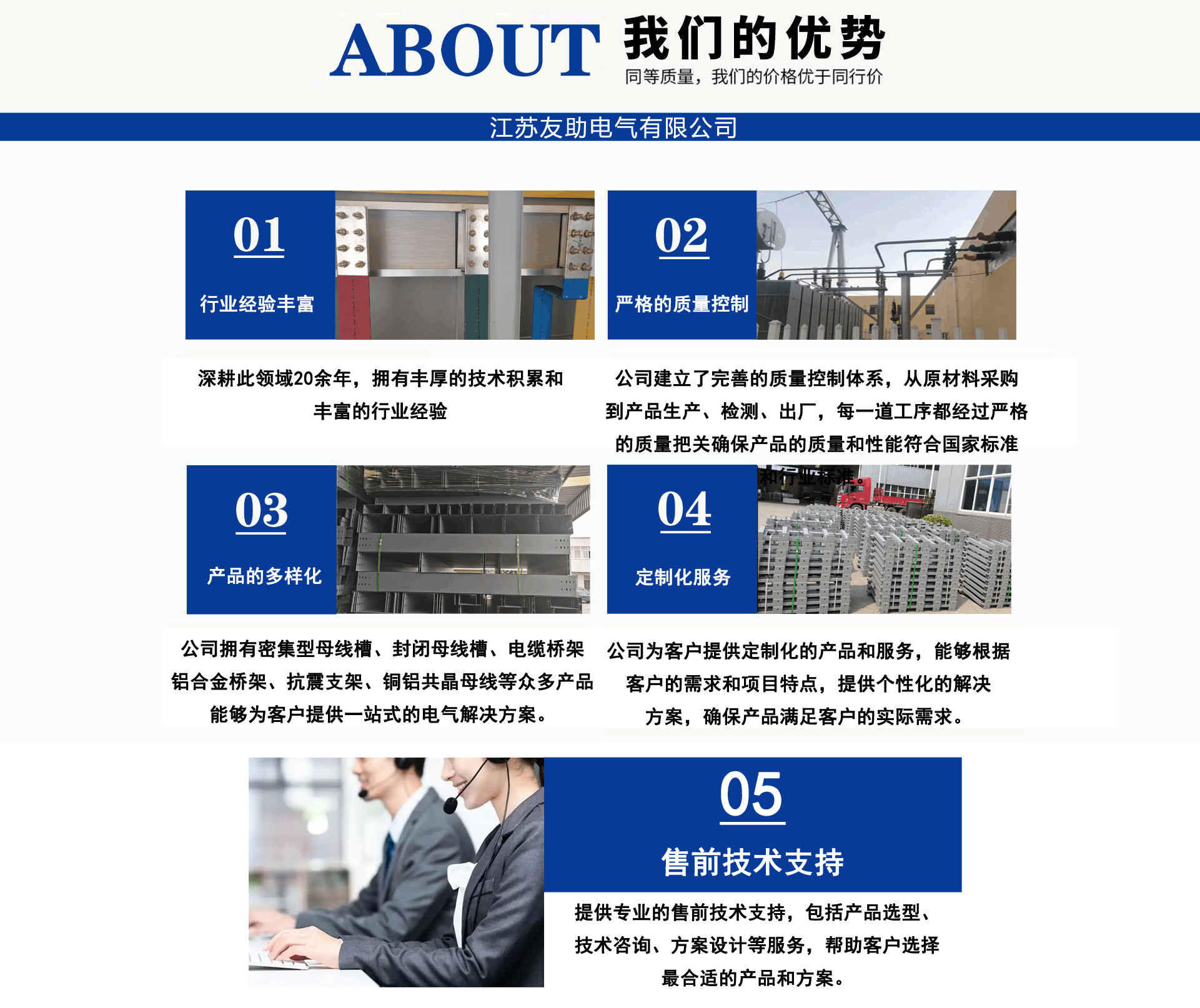 江蘇友助電氣有限公司地處中國工程電氣生產(chǎn)基地-一江蘇省揚中市。經(jīng)營范圍:電纜橋架,母線槽(橋),管型母線,銅軟連接(伸縮節(jié)),高低壓開關(guān)柜,配電箱,抗震支架產(chǎn)品系列。 公司宗旨:客戶至上。已成功為江蘇二十屆省運會會場-泰州體育館,南京寶龍商業(yè)綜合體,張家口百兆瓦風(fēng)電場,濟源市婦幼醫(yī)院,威海市未來科技園,湖北皇恩燁新材料科技有限公司,南京中央路小學(xué),南通中天大酒店,新疆新安特鋼有限公司,河北省送變電有限公司,南京南微醫(yī)學(xué)研發(fā)基地等多項工程配套服務(wù),我們愿與您精誠合作,互利共贏!公司技術(shù)人員深耕橋架,母線領(lǐng)域30年,為您提供橋架,母線槽疑難問題解決方案。母線槽不論每相是單排,雙排,三根排重疊,不管有多少個水平彎、垂直彎,轉(zhuǎn)接排在發(fā)貨前預(yù)裝一遍,確保尺寸無誤。到現(xiàn)場直接擰螺絲,效率高,橫平豎直,規(guī)規(guī)矩矩,符合標準,供電局,業(yè)主,監(jiān)理,驗收易通過。供貨周期3-7天。為了讓尊貴客戶您,設(shè)備安全通電,高枕無憂。我們提供如下售前售中售后服務(wù): 售前:免費技術(shù)支持,咨詢?!∈壑?免費現(xiàn)場精確測繪、設(shè)計。 售后:安裝服務(wù),免費指導(dǎo)?!≠|(zhì)量是生命,客戶是源泉。承諾客戶的,一定全力做到。讓我們一起進步!...
